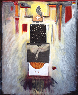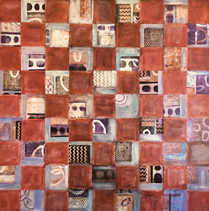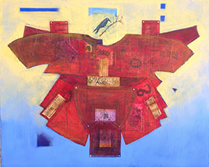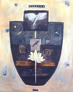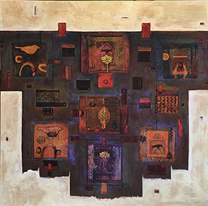 The mono-type gel prints which I produce have inspired the creation of these mixed media paintings. The gel prints are done on vintage ledger pages and later collaged onto the canvas surface. The painting then begins and the final layers are built using acrylic washes.